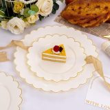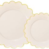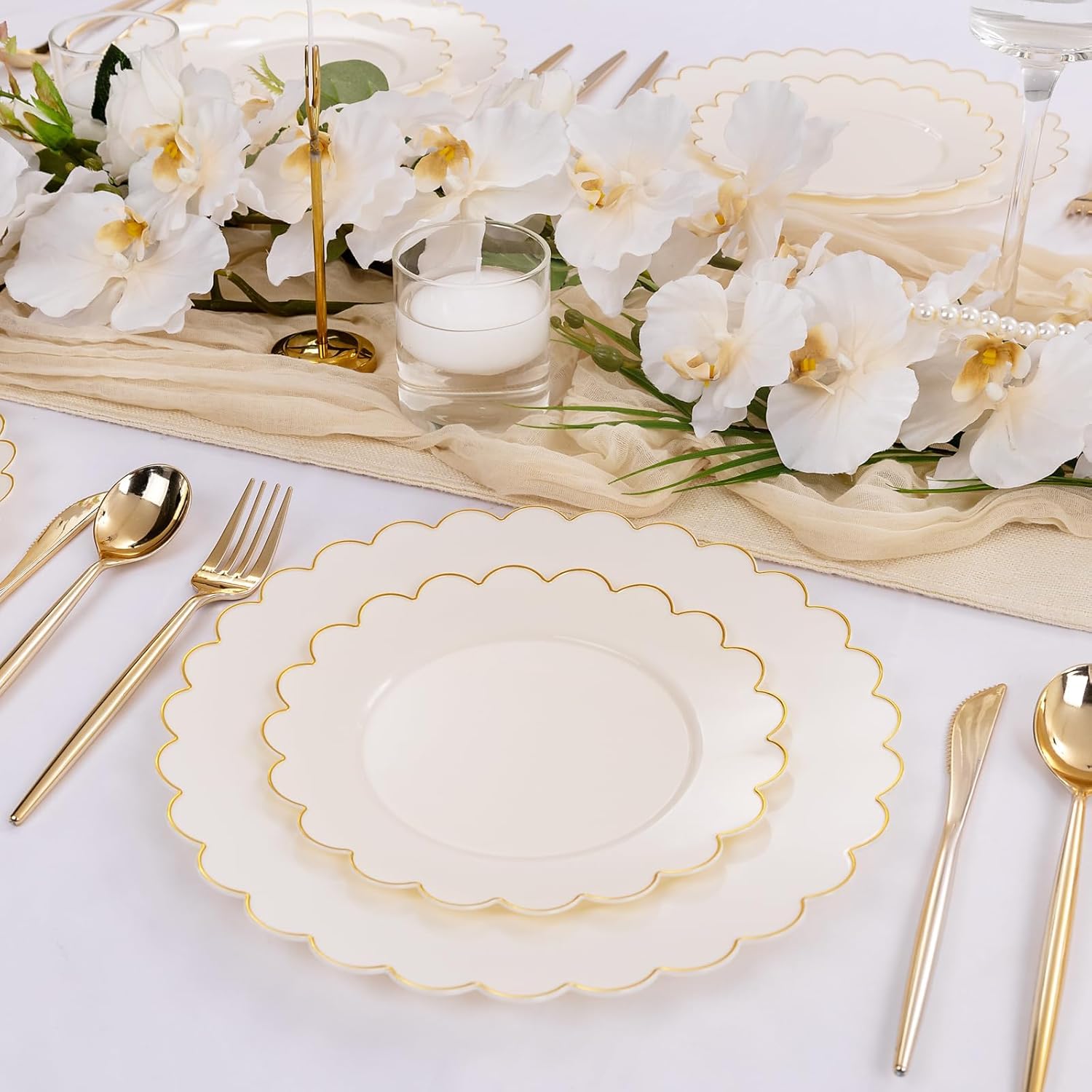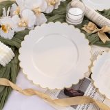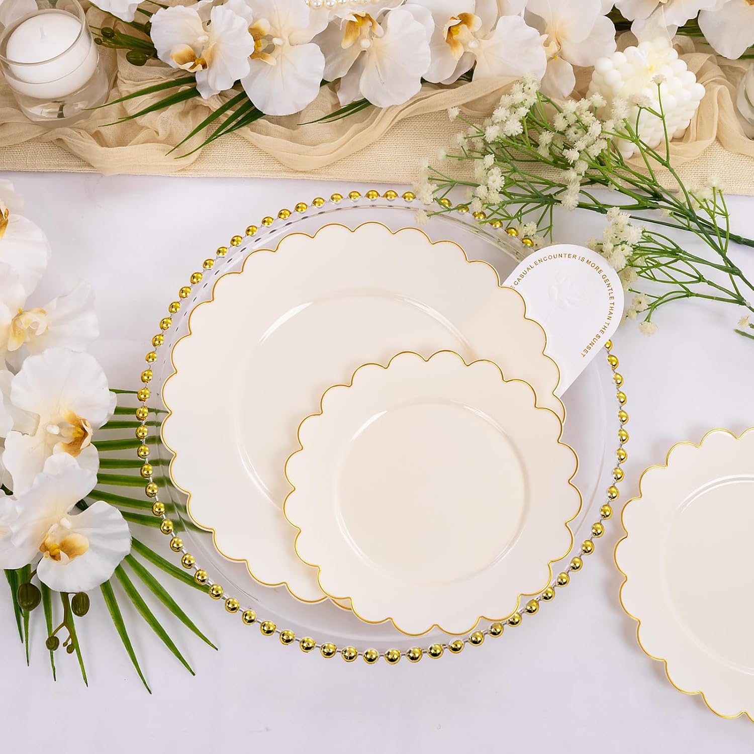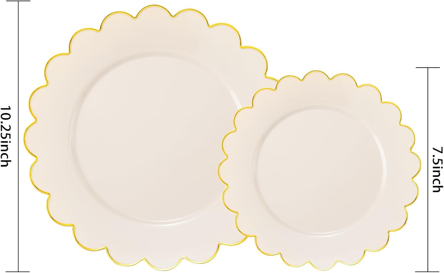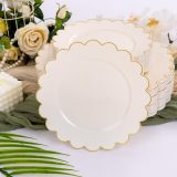 Crafted from high-quality plastic, these plates offer the look of traditional tableware with the convenience of disposable dishes. The ivory and gold scalloped design adds a touch of sophistication to your table setting, making it ideal for weddings, parties, receptions, and more.